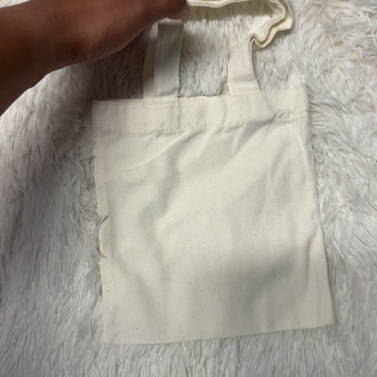 This tote bad is 8.5x8 perfect for party favors,and small gifts.